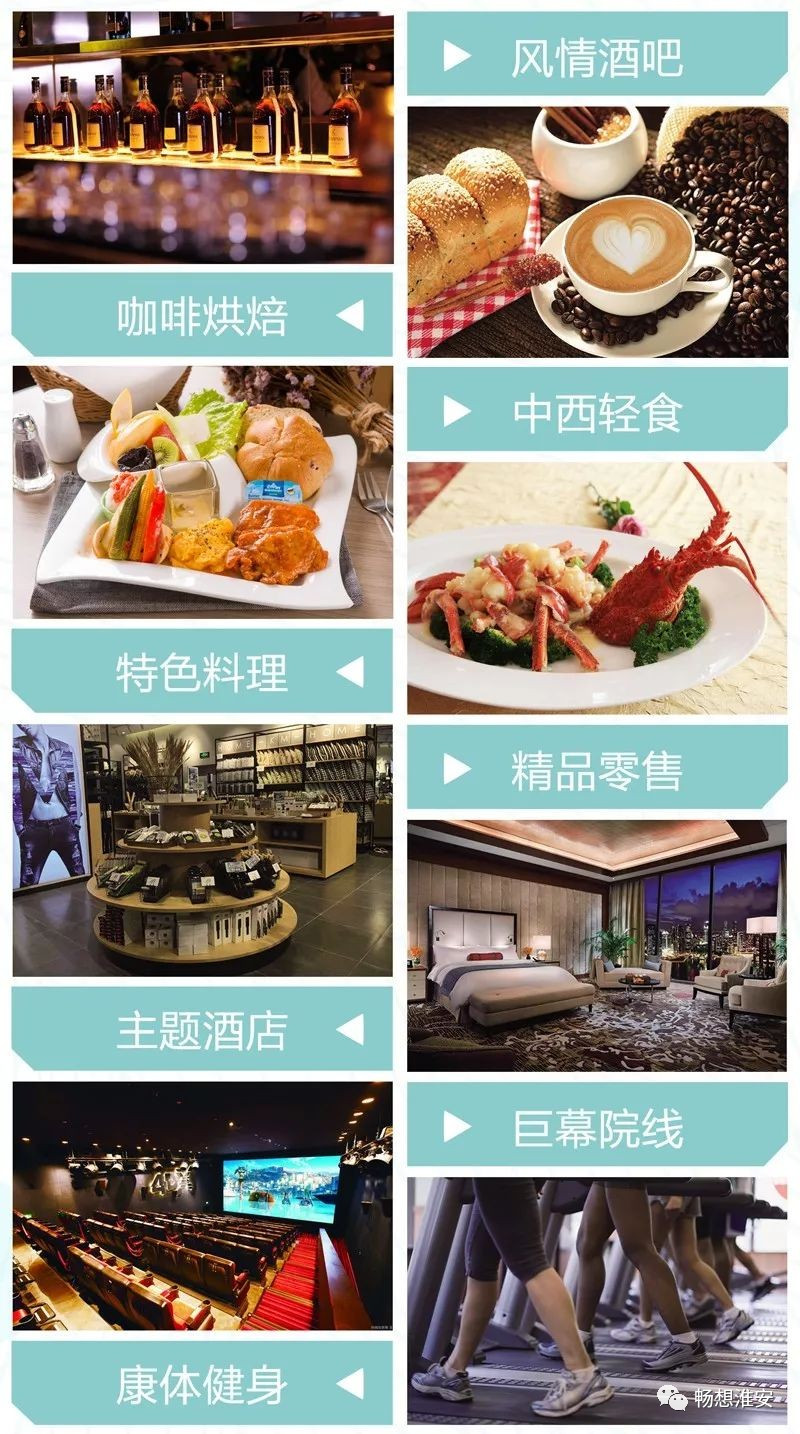 八大業(yè)態(tài):主題酒店、風情酒吧、特色料理、中西輕食、精品零售、咖啡烘焙、康體健身、巨幕院線,與淮安現(xiàn)有傳統(tǒng)購物中心形成差異化互補。